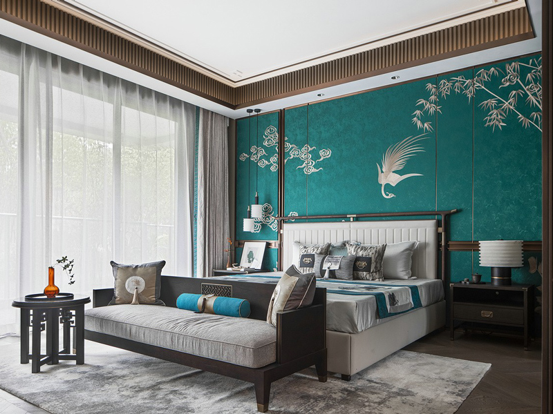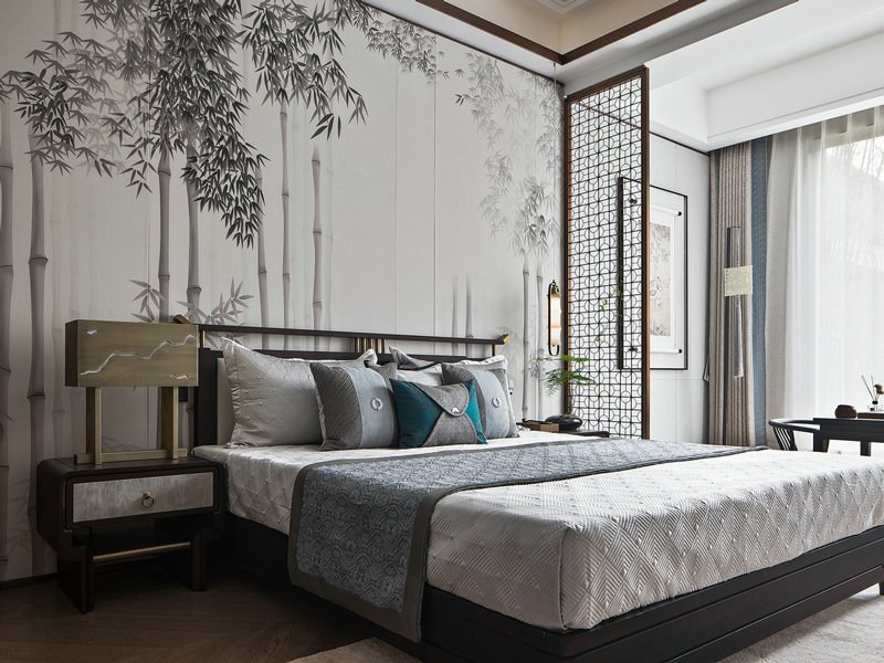 次卧背景采用水墨山竹墙布,给人静谧雅致的视觉氛围,营造出大气富有生机的睡眠环境。