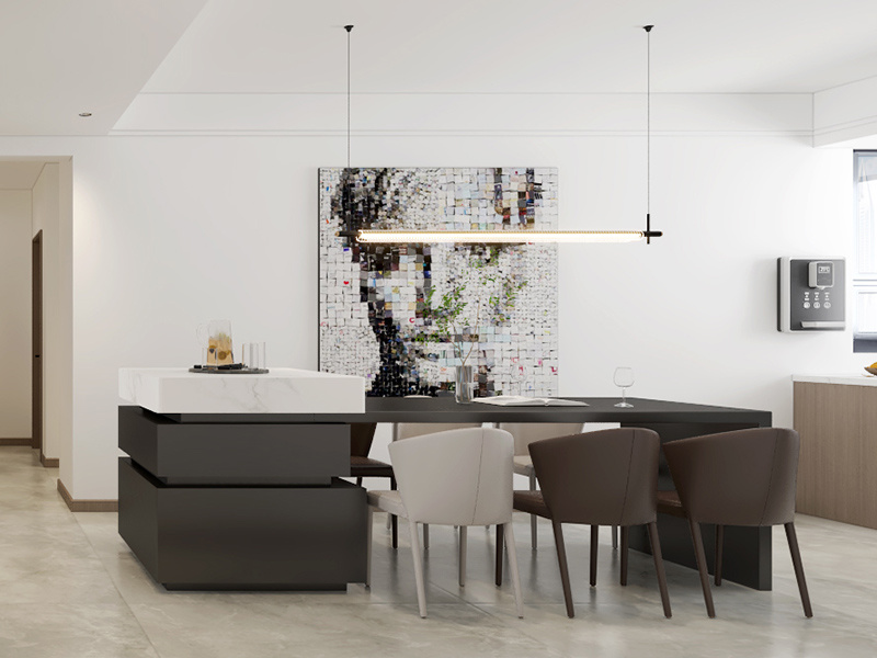 以白、深灰、棕为简洁色调,大理石岛台与极简餐桌椅搭配,艺术拼贴挂画注入个性。日常用餐或小聚时,利落线条与质感材质交融,既显现代干练,又借艺术氛围营造出松弛且有格调的饮食社交场域,适配品质用餐生活。