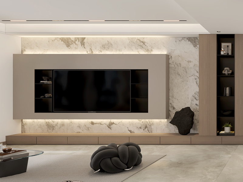 米白与大理石纹理构筑空间基底,嵌入式收纳与线性灯光简洁利落,石材的天然质感与极简造型结合。休闲观影时,利落布局与温润材质平衡,既保障视觉的干净时尚,又营造出静谧舒适的休闲氛围,契合现代简约的观影需求。