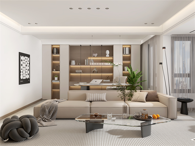米白、木色营造柔和底色,一体化布局将休闲与办公空间自然衔接,通透收纳柜提亮层次感。日常休闲或居家办公时,柔和色调与极简线条交融,既为社交提供松弛场域,又能满足效率工作需求,适配现代多元生活场景。