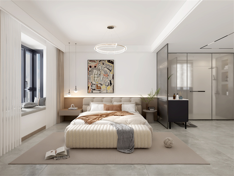 白与暖棕为主调,软质床具柔化空间,艺术挂画增添个性,通透收纳兼顾实用与美学。休憩时,低饱和色调与简约设计融合,既保留现代风格的利落感,又借柔软织物与温馨灯光,打造出静谧舒适的睡眠私域,满足深度放松需求。